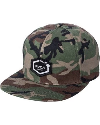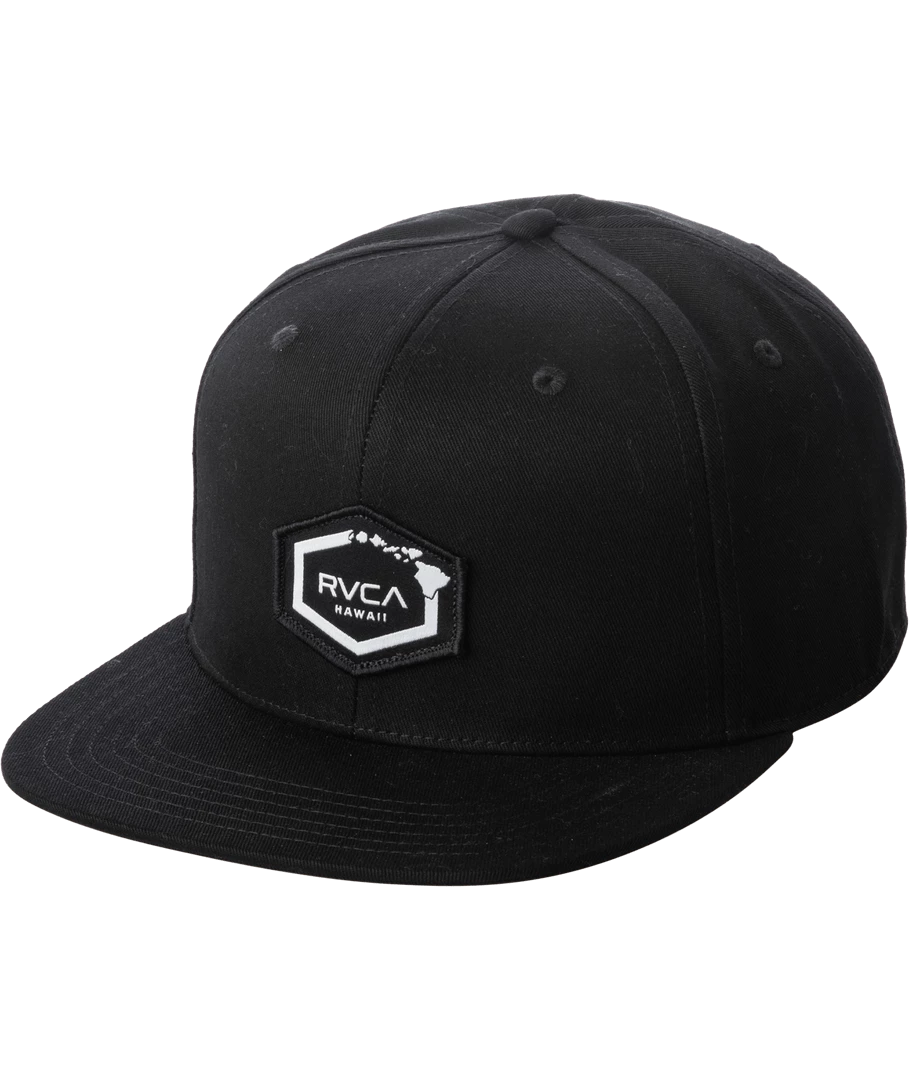 Mid Fit. Structure 5 panel snapback hat. Front Hawaii patch logo. RVCA flag label at back. Â
