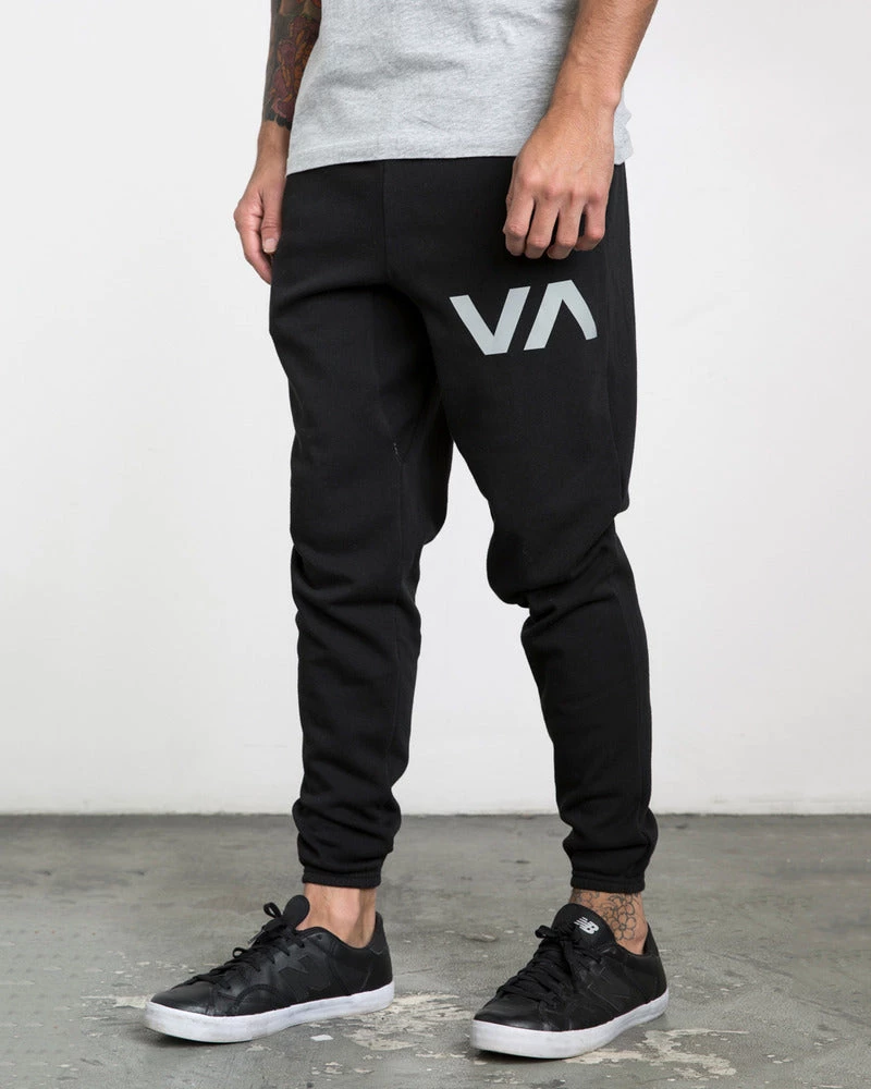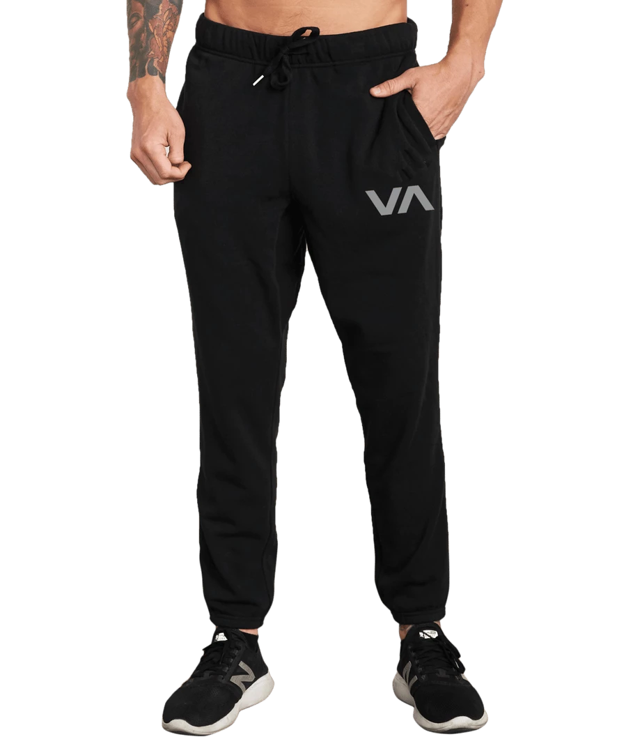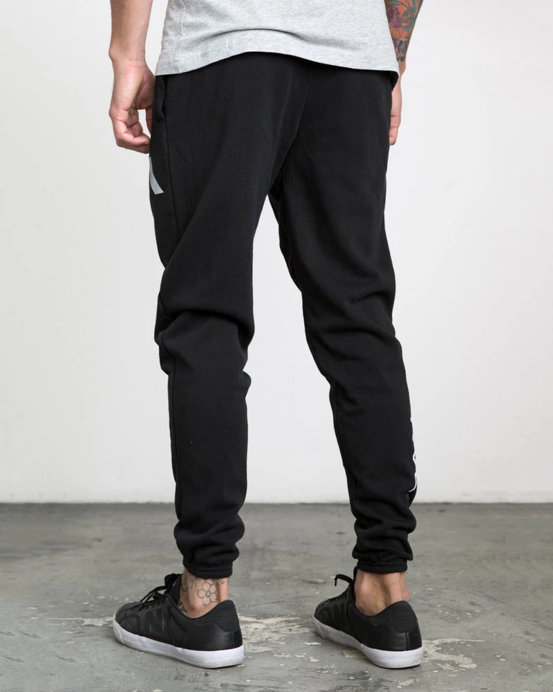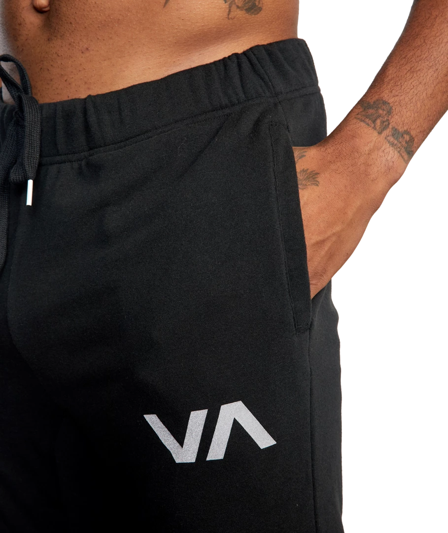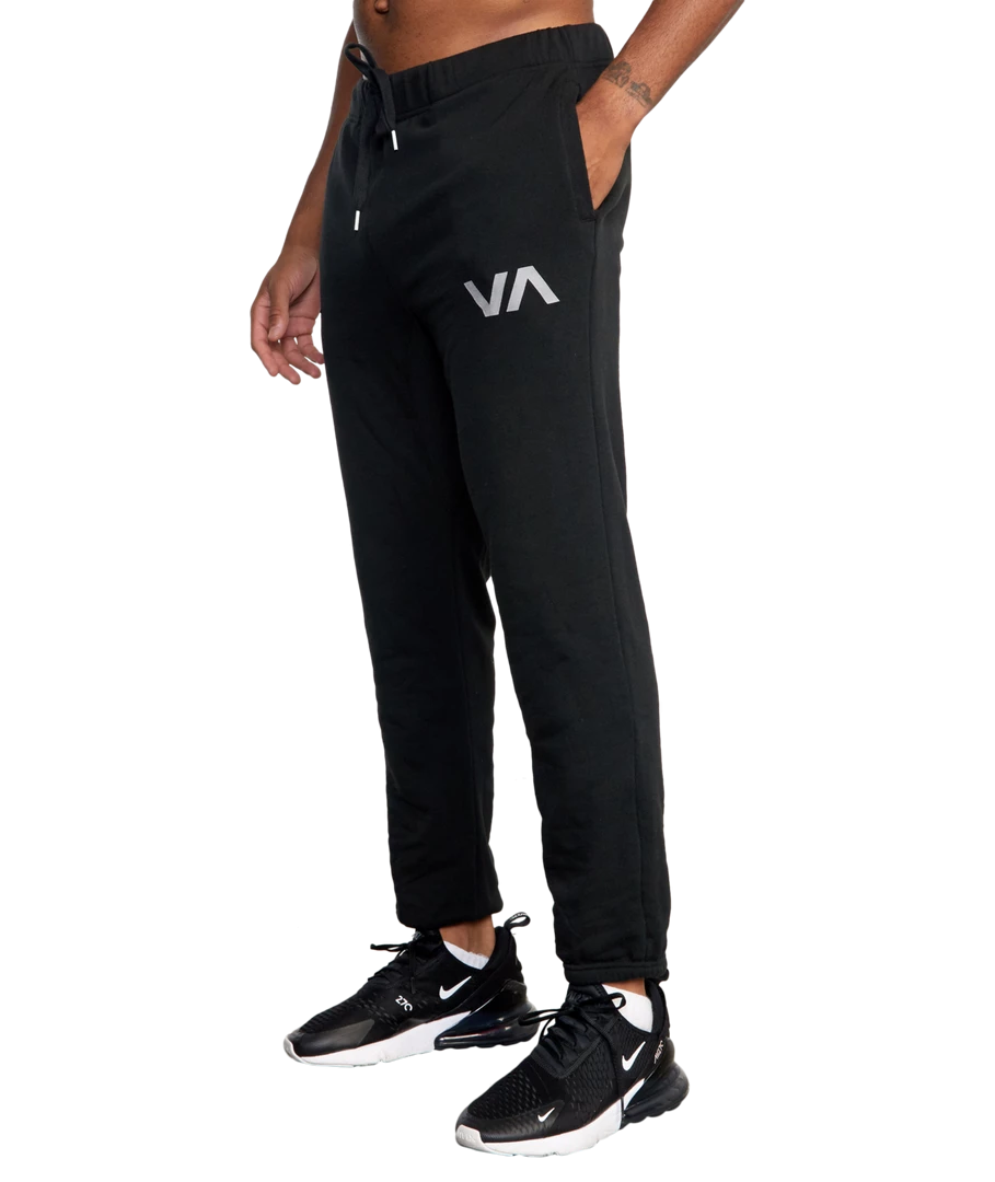 The Swift Sweat Pant is a cotton-blend fleece sweatpant with an elastic waistband, shrink wrapped drawcords, and front welt pockets. It has a relaxed fit at the hips and thighs and a tapered skinny fit through the legs. It’s finsihed with reflective VA print at the wearer’s left thigh, a RVCA print at the wearer’s back right leg, and a single welt back pocket.