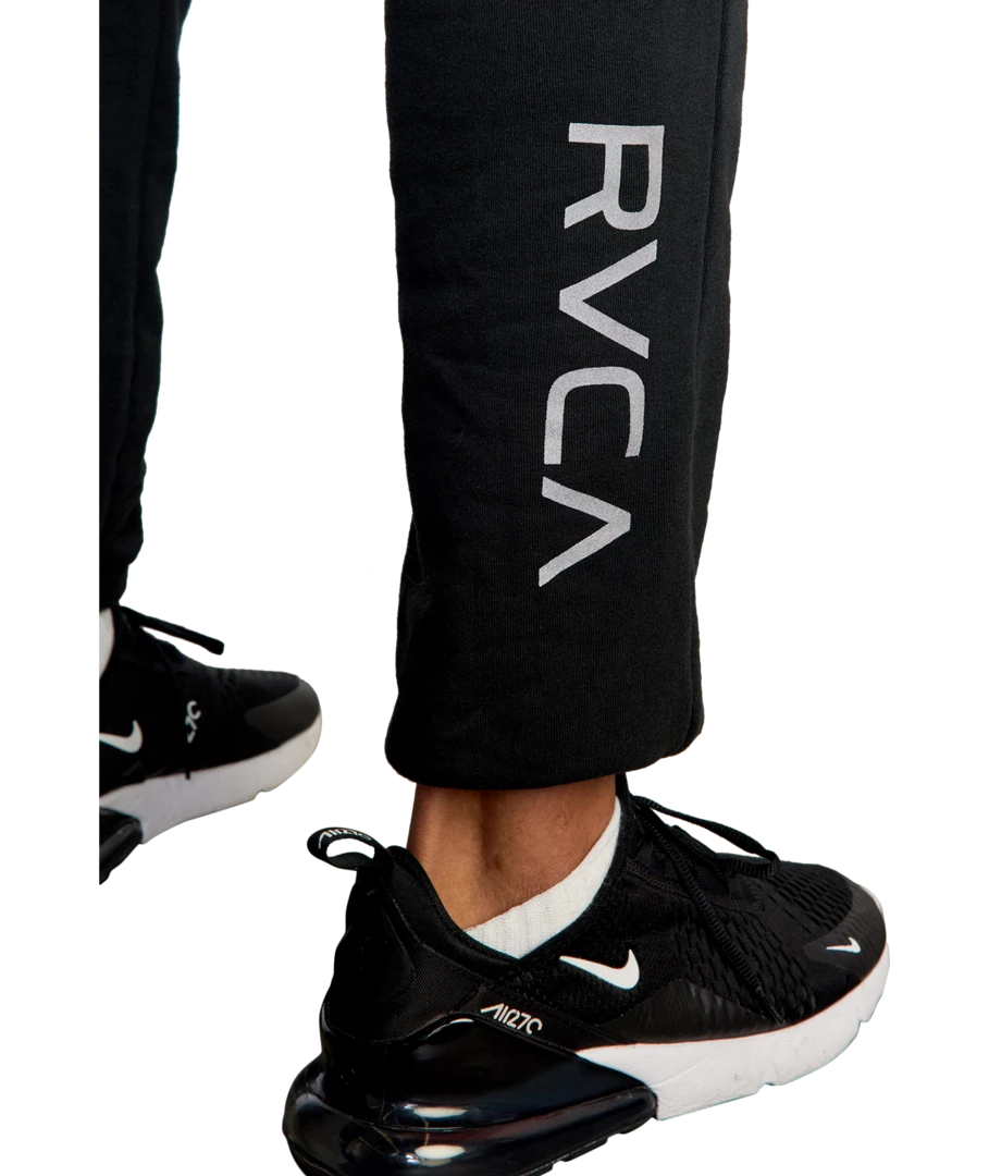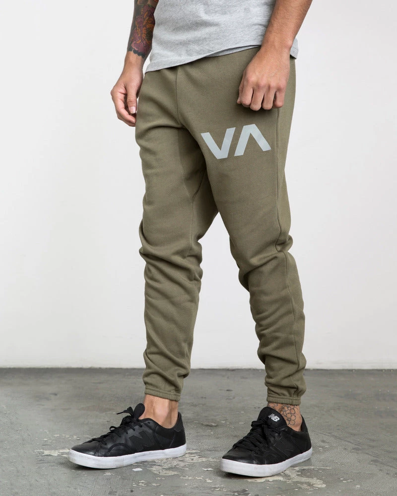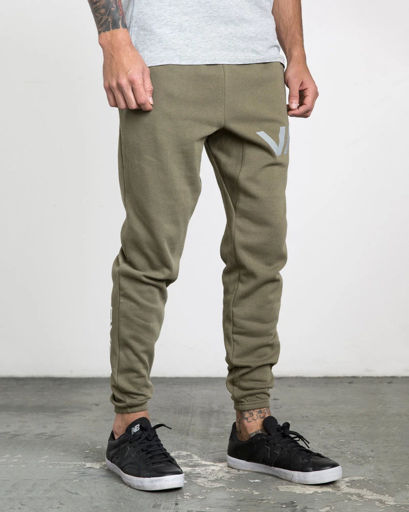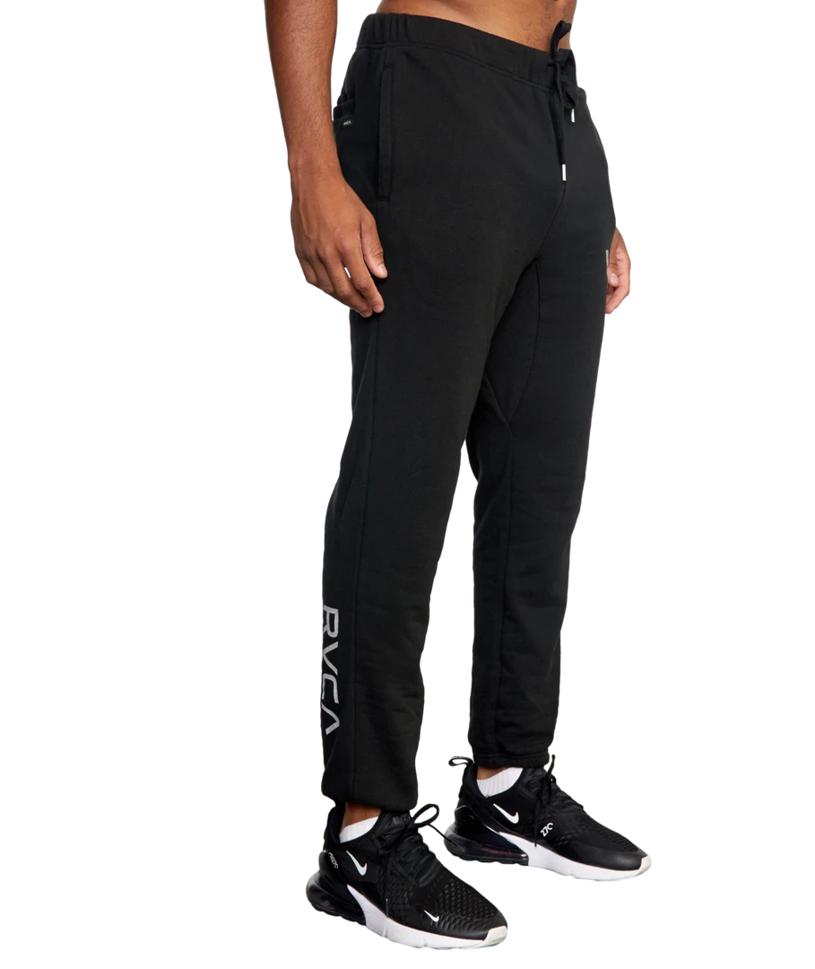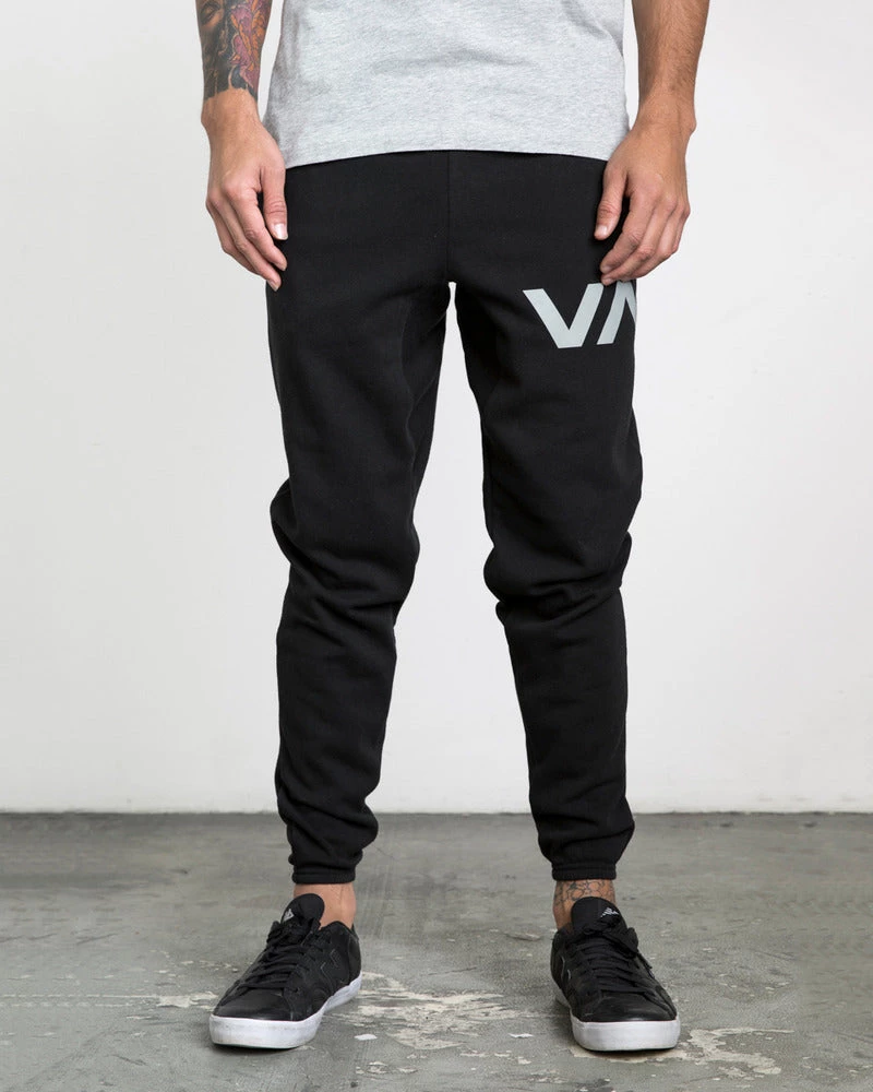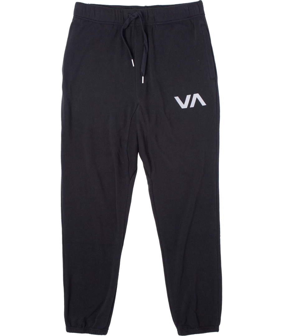 The Swift Sweat Pant is a cotton-blend fleece sweatpant with an elastic waistband, shrink wrapped drawcords, and front welt pockets. It has a relaxed fit at the hips and thighs and a tapered skinny fit through the legs. It’s finsihed with reflective VA print at the wearer’s left thigh, a RVCA print at the wearer’s back right leg, and a single welt back pocket.