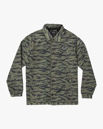 Hide from tropical downpours and stand out from the standard with the RVCA Jungle Camo Coaches Jacket. Covered in a custom camouflage print and in a water-resistant DWR coating, the original coach’s jacket keeps the rest classic with a soft tricot lining, snap front closure and welt pockets. The RVCA Hawaii collection jacket offers lightweight heat, finished with a RVCA Hawaii Hex patch at chest. Â