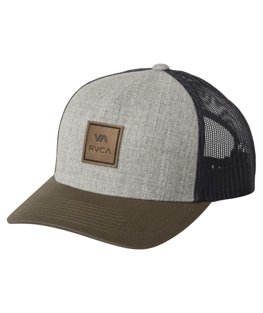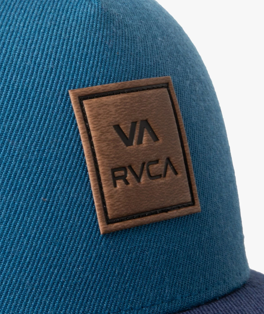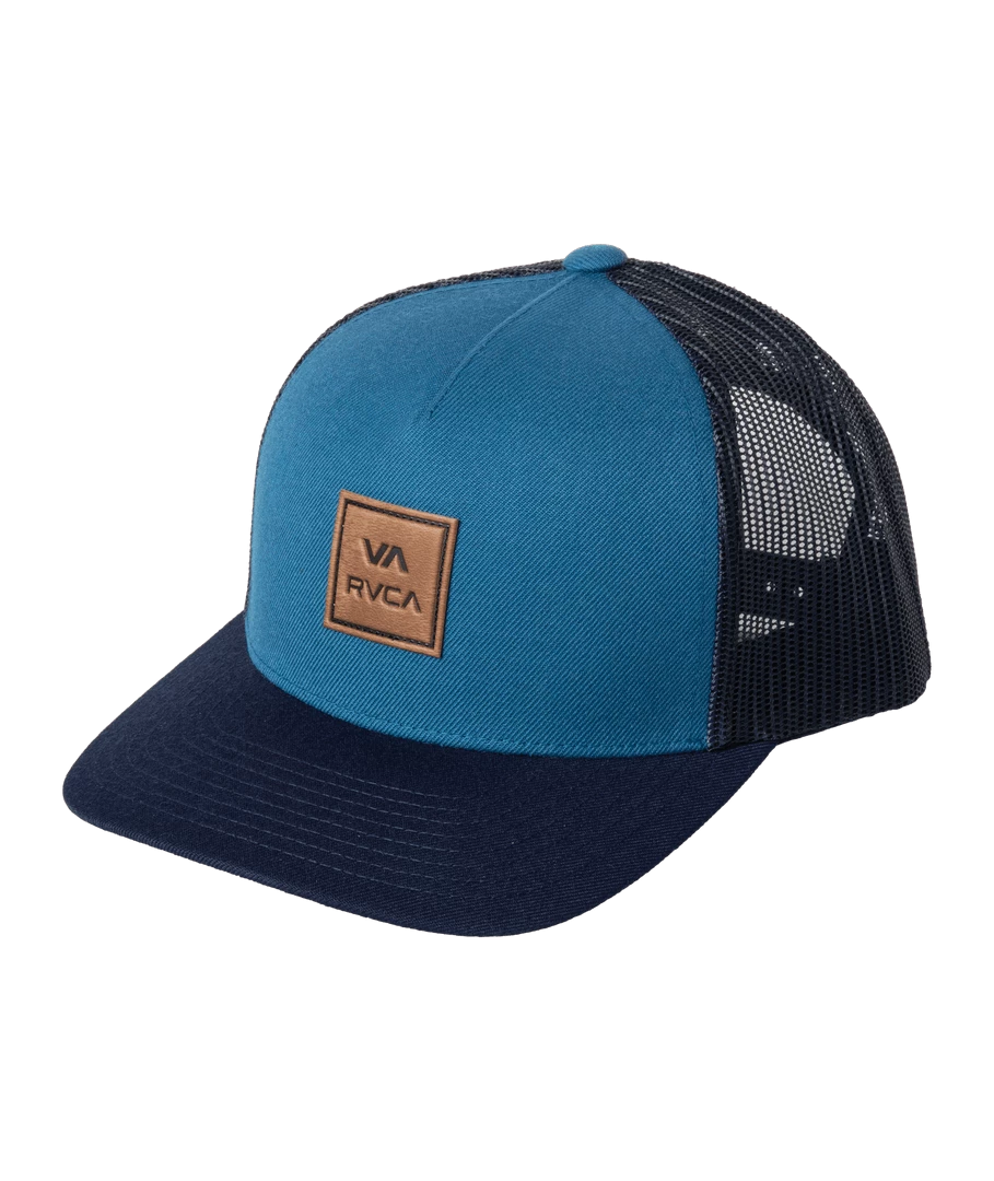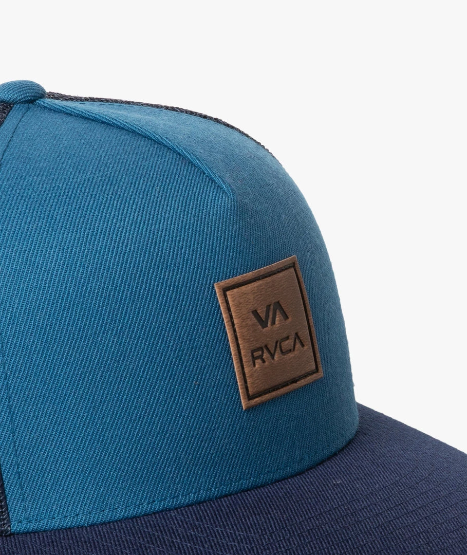 The RVCA VA All The Way Curved Brim Trucker Hat is a 5-panel mesh back trucker hat with a curved bill. It has a RVCA polyurethane embossed patch at the center front and a RVCA flag label at the back.