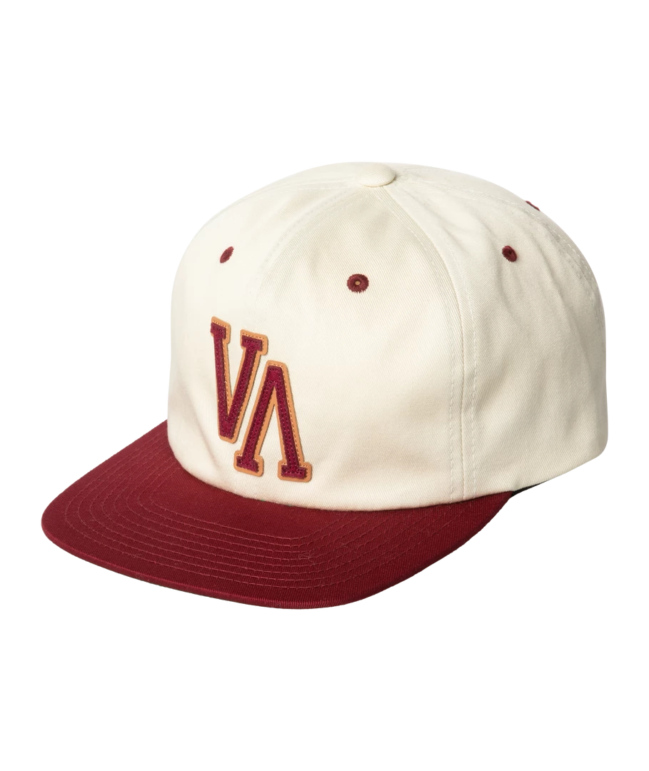 Comfort meets style in the RVCA Univ Snapback hat, designed to keep your skull protected all day long. Made from cotton twill for a comfortable feel, this men’s strapback hat features six panel construction in an unstructured, easy, mid fit. Built with an adjustable leather claspback closure for added style, this closet essential is finished off with a custom felt VA logo at the front with leather backing for a pro team look. Â